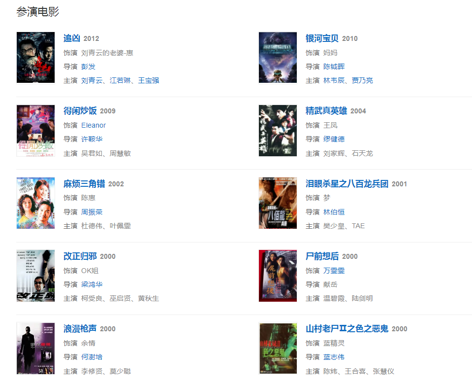 代表作品:我和僵尸有个约会、精武门、我和春天有个约会、枪神、大提琴与点三八、碧血青天珍珠旗、龙在边缘、白发魔女传Ⅱ、胜者为王Ⅱ天下无敌、郎心如铁、老表,你好hea!