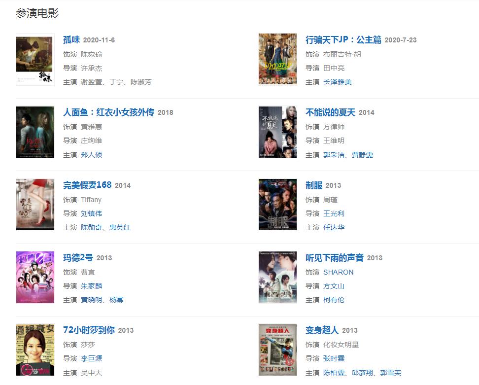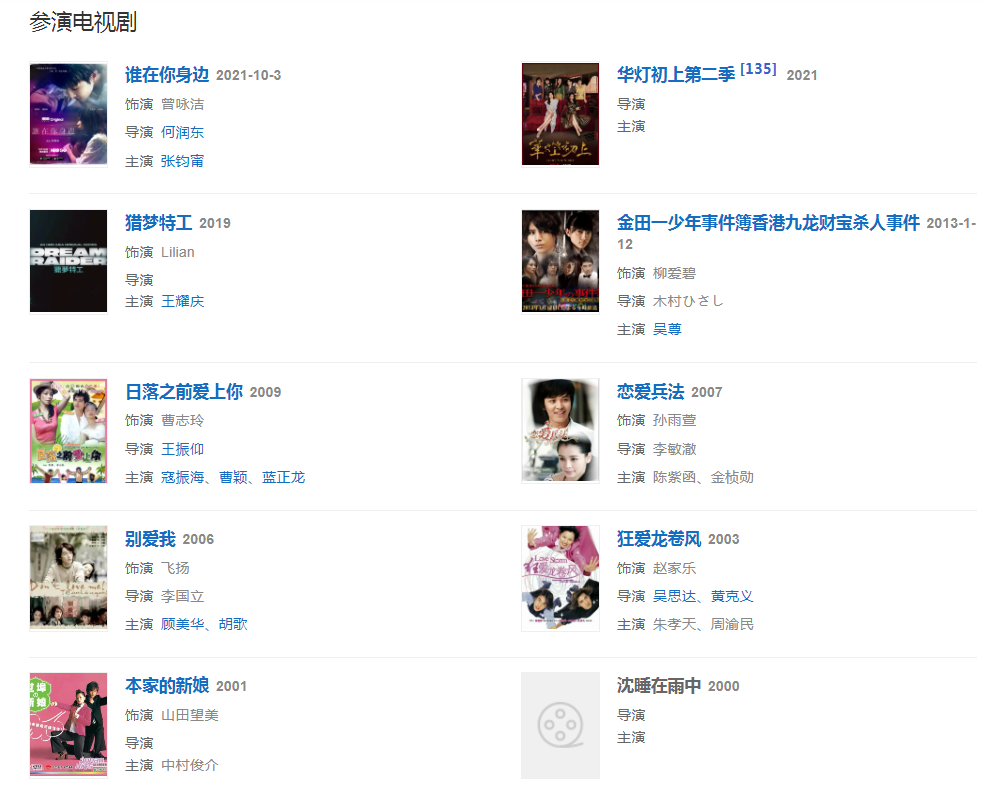 代表作品:狠狠爱、爱笑的眼睛、假扮的天使、我爱你x4、大麻烦、Vivi and...、不败的恋人、笑林小子、星海、云水谣、非诚勿扰、人鱼朵朵、孤味、I'm V、偏爱你的心、恋爱兵法