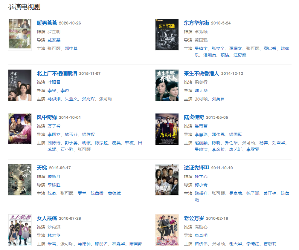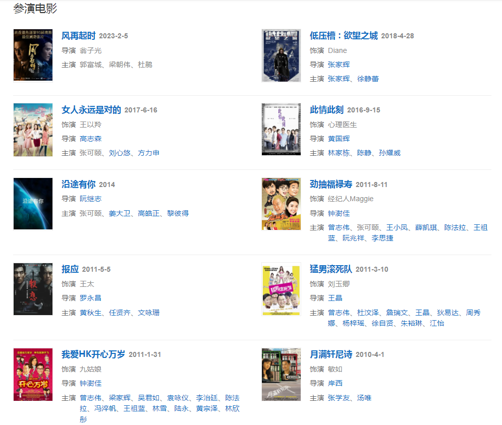 代表作品:九五至尊、难兄难弟、金枝欲孽、法证先锋III、迷离档案、地狱天使、女人最痛、来生不做香港人