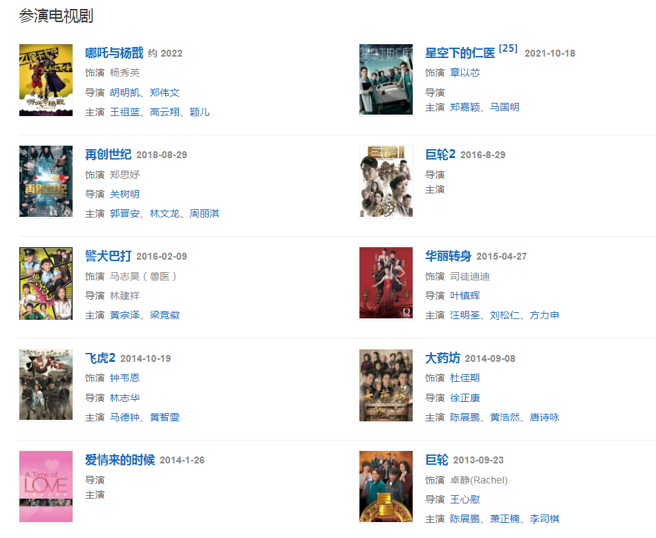 代表作品:溏心风暴、护花危情、金石良缘、随时候命、十分爱、大药坊、再创世纪、发誓、其实我不快乐