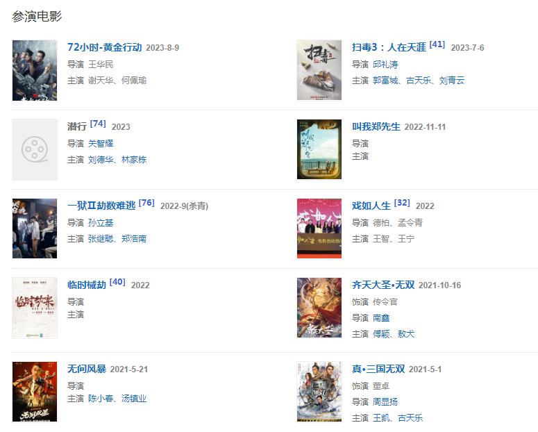 2021年3月18日,主演的奇幻亲情喜剧电影《窈窕老爹》在爱奇艺独家播出 。4月29日参与主演的电影《真·三国无双》在中国香港上映、5月1日在中国大陆上映;5月,与陈小春、汤镇业合力参演港式警匪片《无间风暴》。10月16日,参演的网络电影《齐天大圣·无双》正式在腾讯视频全网独播。