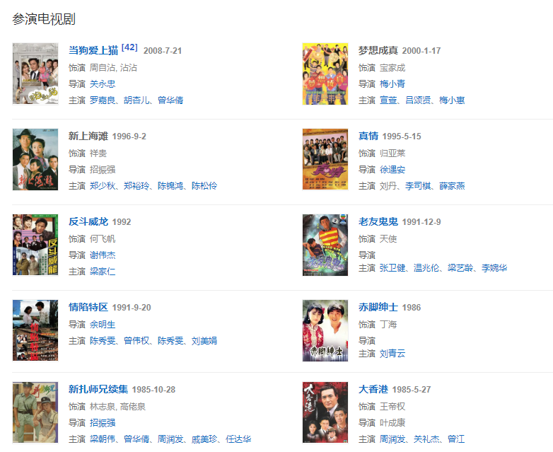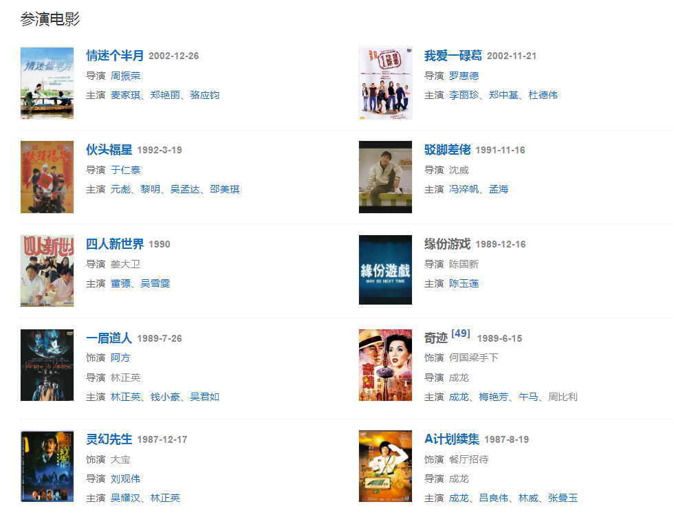 1989年,在由林正英执导的恐怖电影《一眉道人》中饰演一眉道长的徒弟阿方。