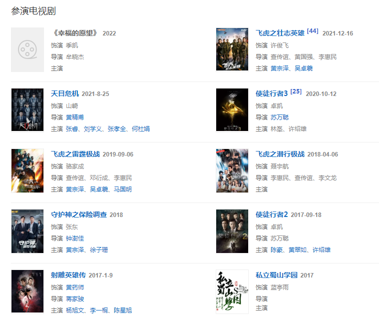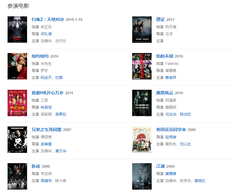 代表作品:射雕英雄传、江湖接班人、学警雄心、学警狙击、刑警、使徒行者
