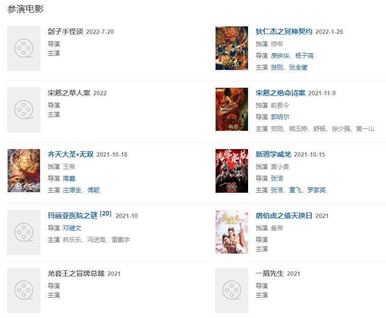2022年,出演由房映华、杨子鸣联合执导的古装探案电影《狄仁杰之冥神契约》,饰演师爷。