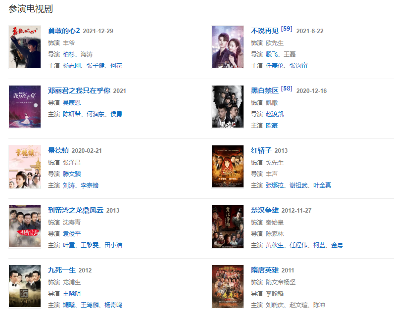 2013年参演电视剧《红轿子》,同年参演悬疑谍战剧《九死一生》。
