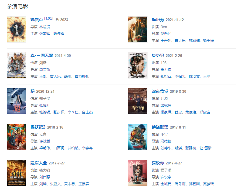 2013年在电影《总铺师》中饰演叶如海,在电影《大尾鲈鳗》中饰演贺祥;
