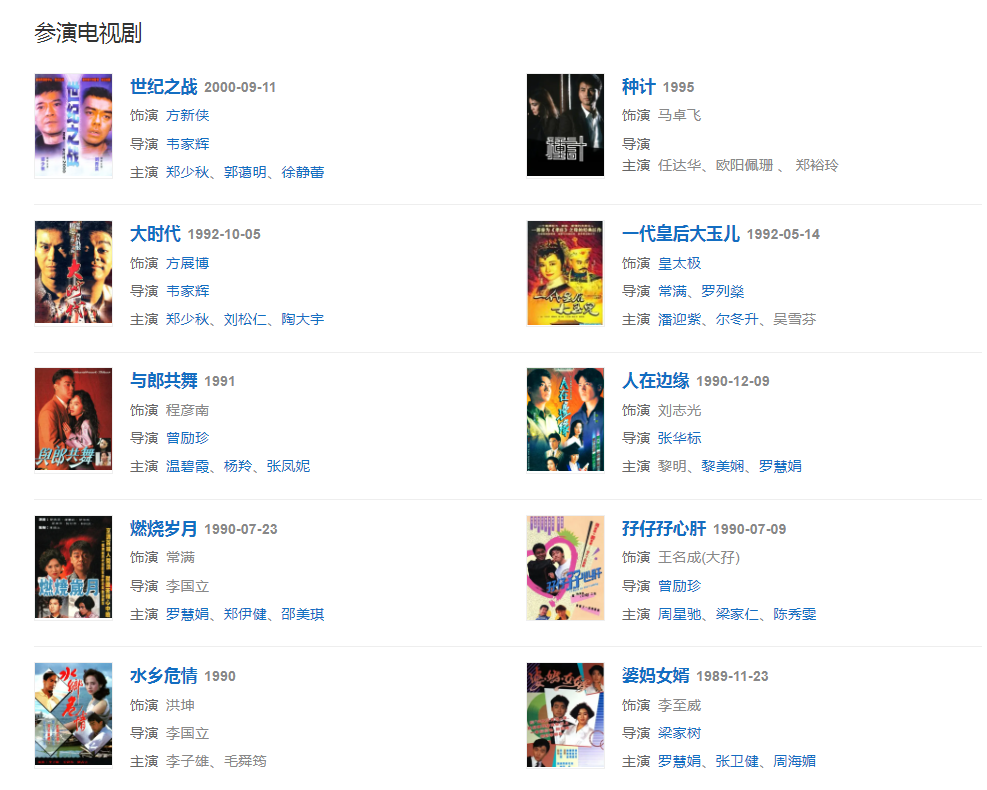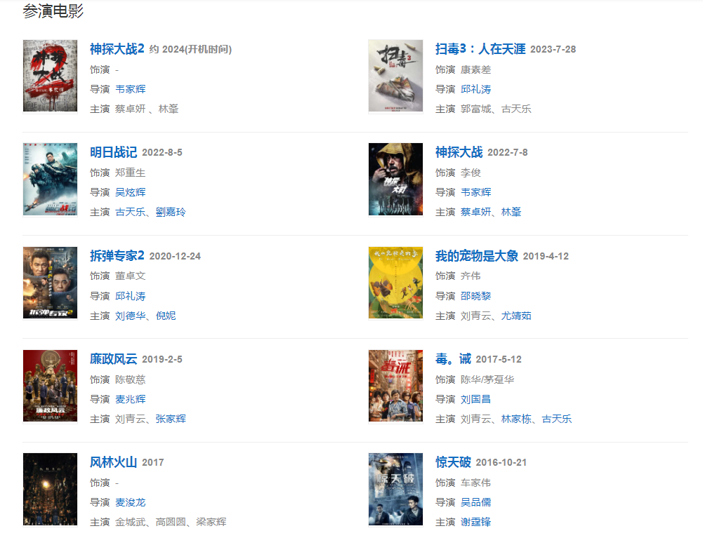 代表作品:消失的子弹、夺命金、窃听风云、神探 、我要成名、新不了情