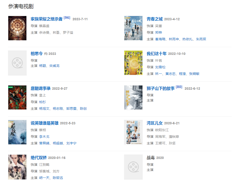 代表作品:天地男儿、难兄难弟、天地豪情、创世纪、流金岁月、昭君出塞、郑和下西洋、富贵门、精忠岳飞