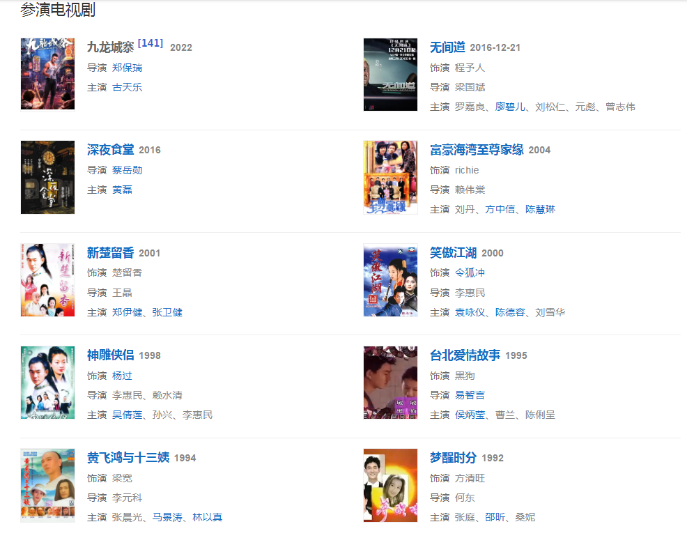 1998年发行专辑《爱像太平洋》,其中歌曲《对面的女孩看过来》《伤心太平洋》成为其代表作;同年在古装剧《神雕侠侣》中饰演杨过 。