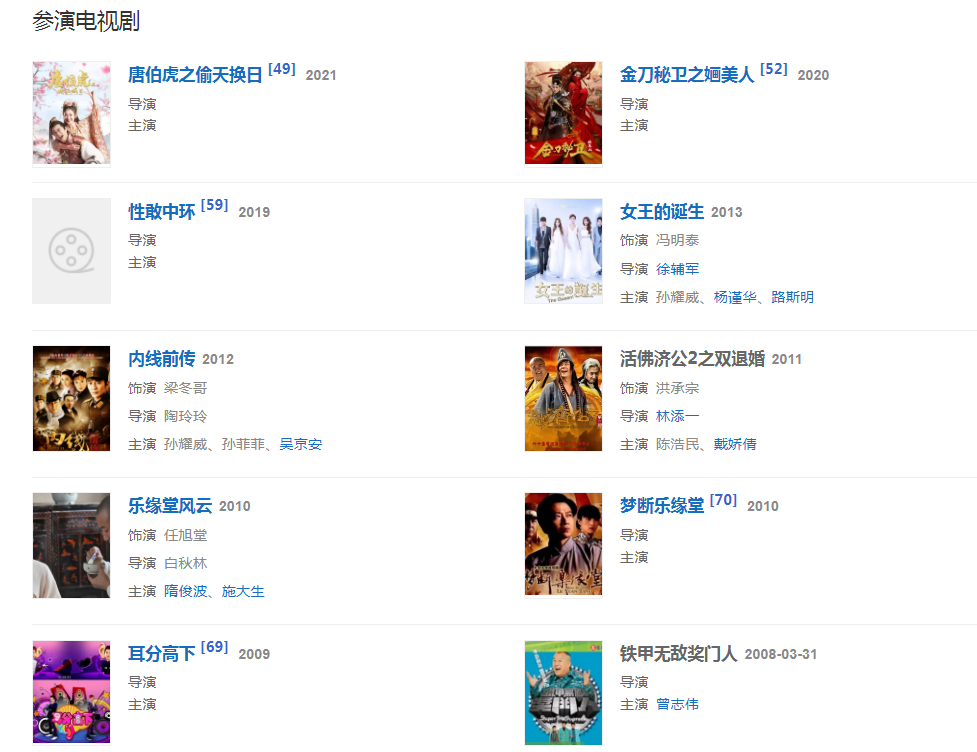 代表作品:爱的故事上集、不属于我的泪、思前恋后、如果生命还有歌、从此我的世界多了一秒、认识你真好、我知道你在等我、乌龙闯情关、怀玉公主、夺命追捕 (2011)