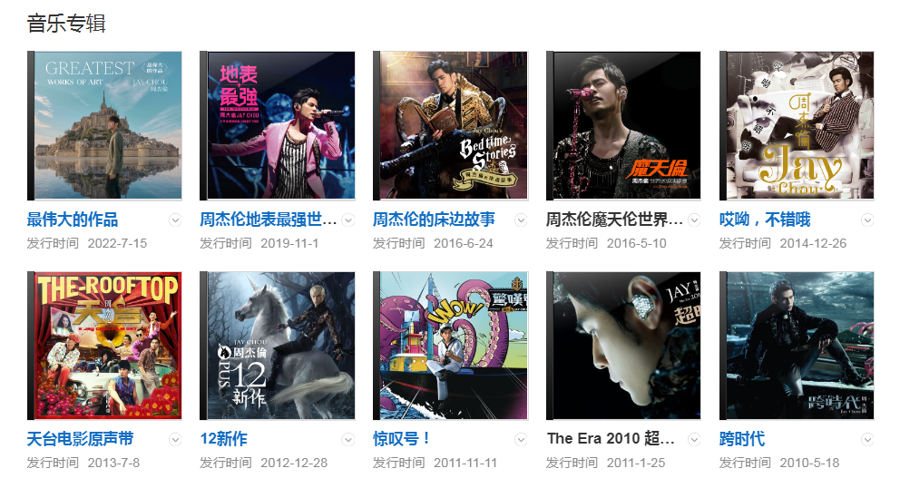 代表作品:七里香、青花瓷、双截棍、简单爱、夜曲、以父之名、稻香、龙卷风、一路向北、晴天、可爱女人、东风破、爱在西元前、轨迹、床边故事、头文字D、不能说的秘密、满城尽带黄金甲、大灌篮、天台爱情