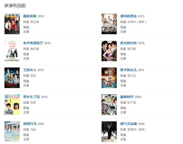 代表作品:紫禁之巅、微笑PASTA、胜女的代价、王的女人、东华春理发厅、廉政英雄、王子变青蛙
