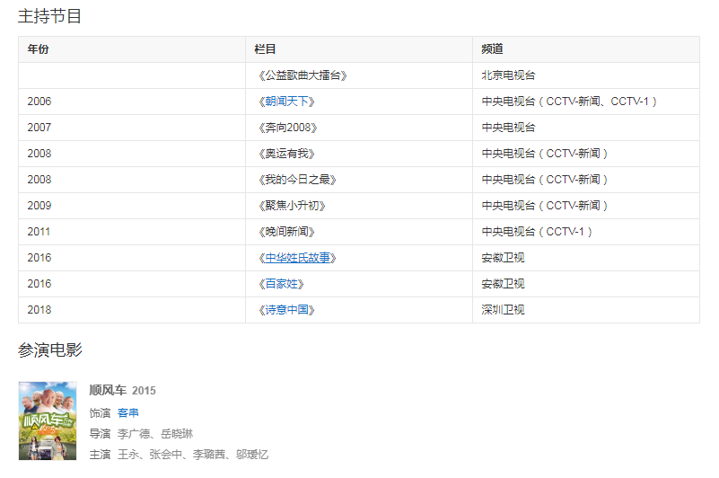 2006年,参加《开心辞典》魅力新搭档的评选活动,获得比赛前三名;同年,担任中央电视台新闻资讯节目《朝闻天下》的主持人。